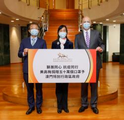 美高梅捐出50萬個外科口罩予澳門特別行政區政府,由美高梅中國控股有限公司首席執行官及執行董事簡博賢先生以及總裁、首席戰略官及董事馮小峰先生代表公司捐贈,並由社會文化司歐陽瑜司長代表特區政府接收。